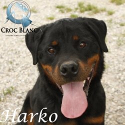 HARKO, magnifique Rottweiler LOF de 9 ans (12/10/2012), qui nous a été confié par sa famille car la femme en avait peur car il était très protecteur des enfants de la maison. Elle l'avait donc mis en enclos au fond du jardin.